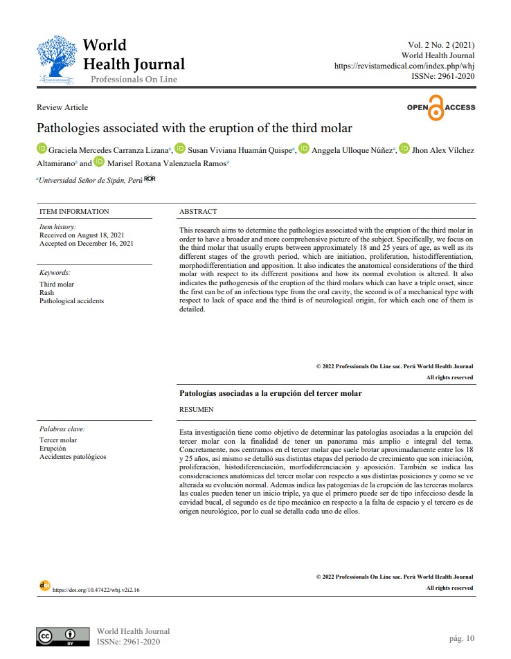 This research aims to determine the pathologies associated with the eruption of the third molar in order to have a broader and more comprehensive picture of the subject. Specifically, we focus on the third molar that usually erupts between approximately 18 and 25 years of age, as well as its different stages of the growth period, which are initiation, proliferation, histodifferentiation, morphodifferentiation and apposition. It also indicates the anatomical considerations of the third molar with respect to its different positions and how its normal evolution is altered. It also indicates the pathogenesis of the eruption of the third molars which can have a triple onset, since the first can be of an infectious type from the oral cavity, the second is of a mechanical type with respect to lack of space and the third is of neurological origin, for which each one of them is detailed.
