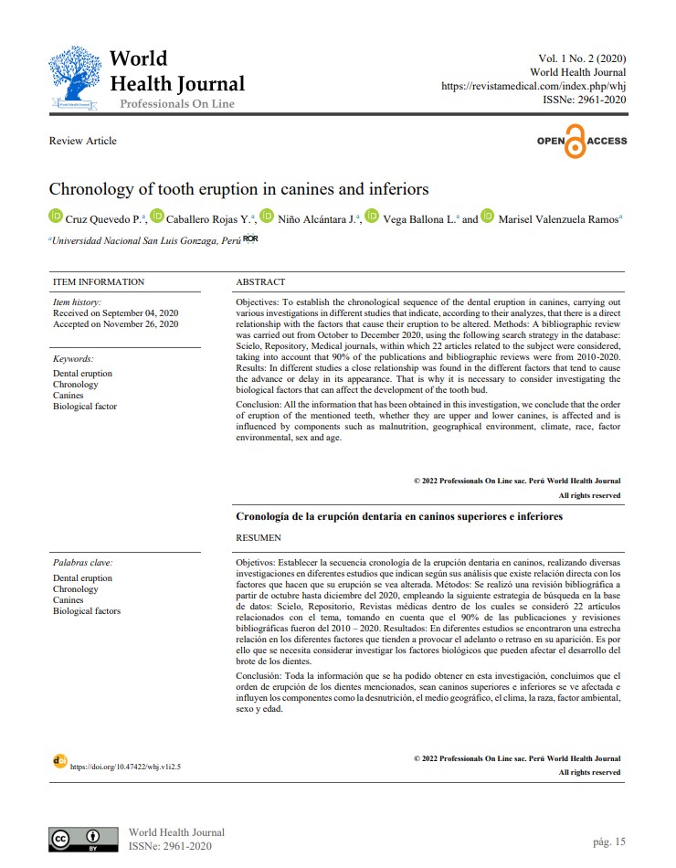 Chronology of tooth eruption in canines and inferiors. (2020). Journal World Health, 1(2), 15-19. https://doi.org/10.47422/whj.v1i2.5